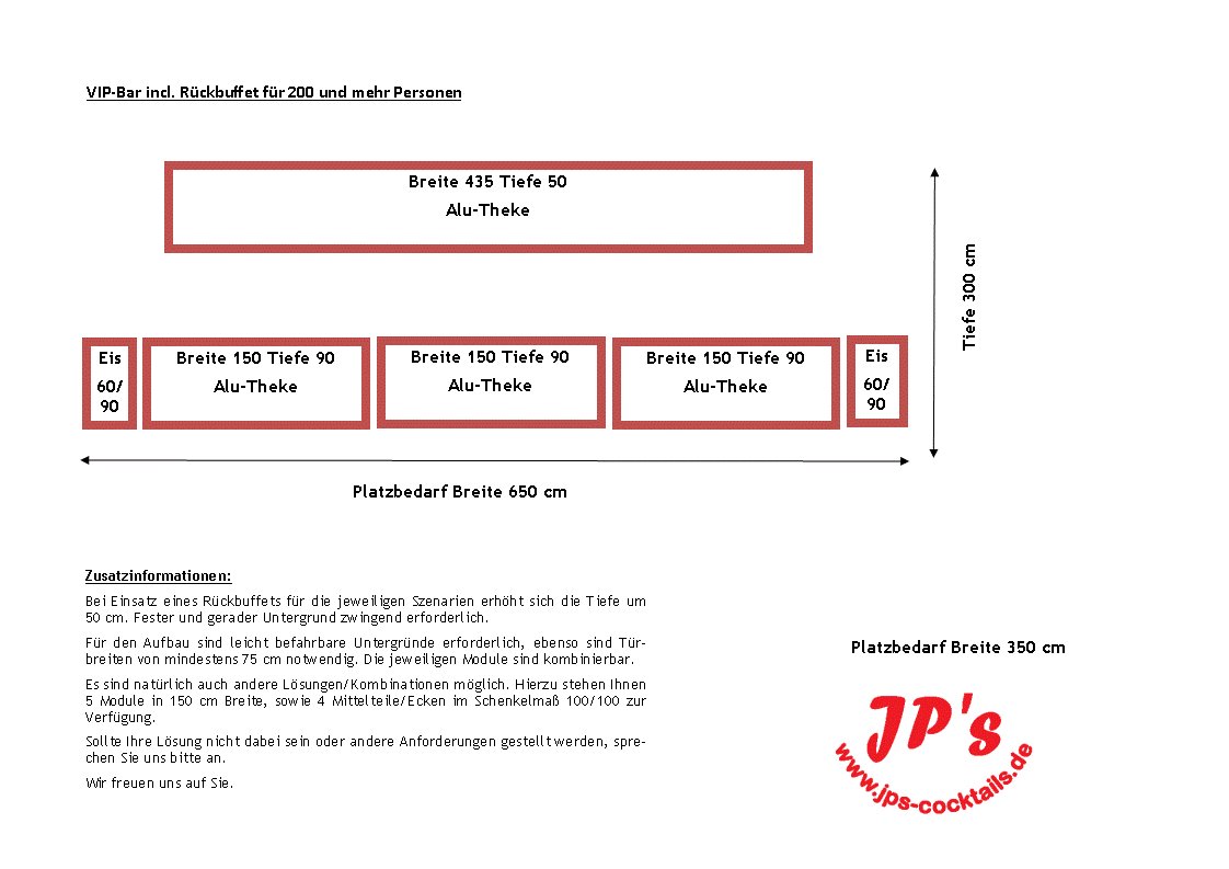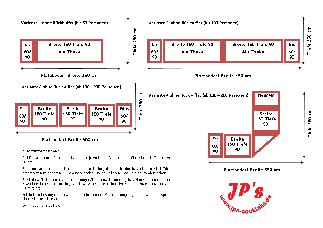 Das Barsystem aus Alu-Elementen lässt keine Wünsche offen. Es können hier bis zu 17,50 m an mobiler Bar aufgebaut werden. Die Aufbauvarianten entnehmen Sie bitte der nebenstehenden Grafik. Dieses System ergänzt sich hervorragend mit Alu-Traversen inklusive einer stimmigen Beleuchtung. Bei Bedarf bereitet JP's gerne den Kontakt zu kompetenten Partner vor. Für Bildansichten klicken Sie bitte auf Impressionen .
